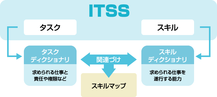 iコンピテンシ・ディクショナリとは、ビジネスに求められる業務(タスク)と、それを支える能力やスキルを「タスクディクショナリ」、「スキルディクショナリ」として体系化したものです。