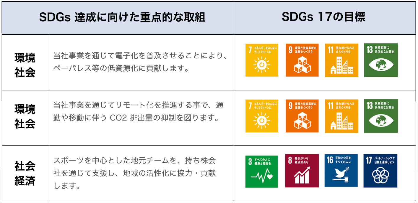 「私たちは、情報処理サービスを核とした製品・サービスを、質の高い IT 技術で提供し、私達と関係する人たちをパートナーと考え共に繁栄することを目的とします」は、SDGs の達成と目的を同じくするものであり、 社員一人ひとりがそのことを自覚し、それぞれの役割を果たしていく事により SDGs の達成に貢献していきます。